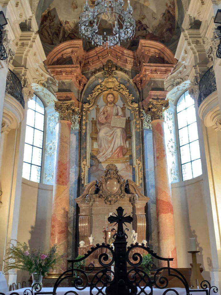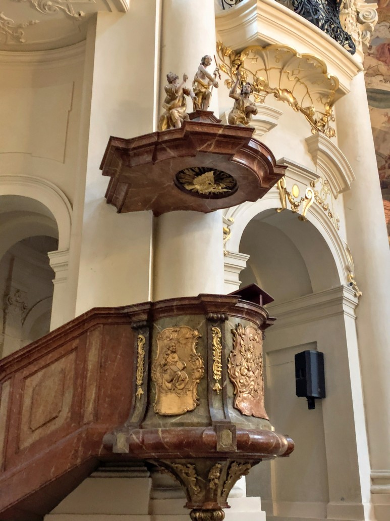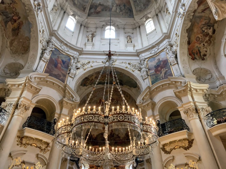 교회 내부에는 성 베드로와 니콜라스, 구약성경의 베네딕트를 주제로 한 성인들의 삶을 묘사한 천장 프레스코화와 오르간이 있습니다. 그림은 1735-1736년에 바이에른 화가 Kosma Damián Assam이 만들었습니다. 인조 대리석 주제단은 1737년부터 시작되었습니다. 교회의 치장 벽토 장식은 Bernardo Spinetti 가 했으며, 입구 정면의 조각 장식은 Antonín Braun이 작업했습니다.