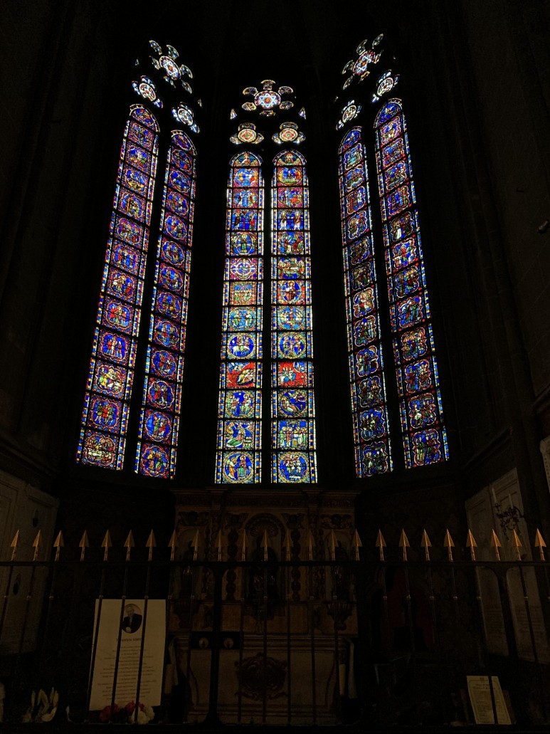 대성당에는 생트샤펠, 샤르트르 대성당, 부르주 대성당 다음으로 프랑스에서 가장 아름다운 중세 스테인드 글라스 창문이 있습니다. 만든 시기에 따라 13세기 합창단과 보행로 예배당의 스테인드 글라스 창, 13세기 후반 합창단의 높은 만, 14세기 초 트랜셉트, 15세기와 16세기의 신도석의 높은 창으로 구분됩니다.
